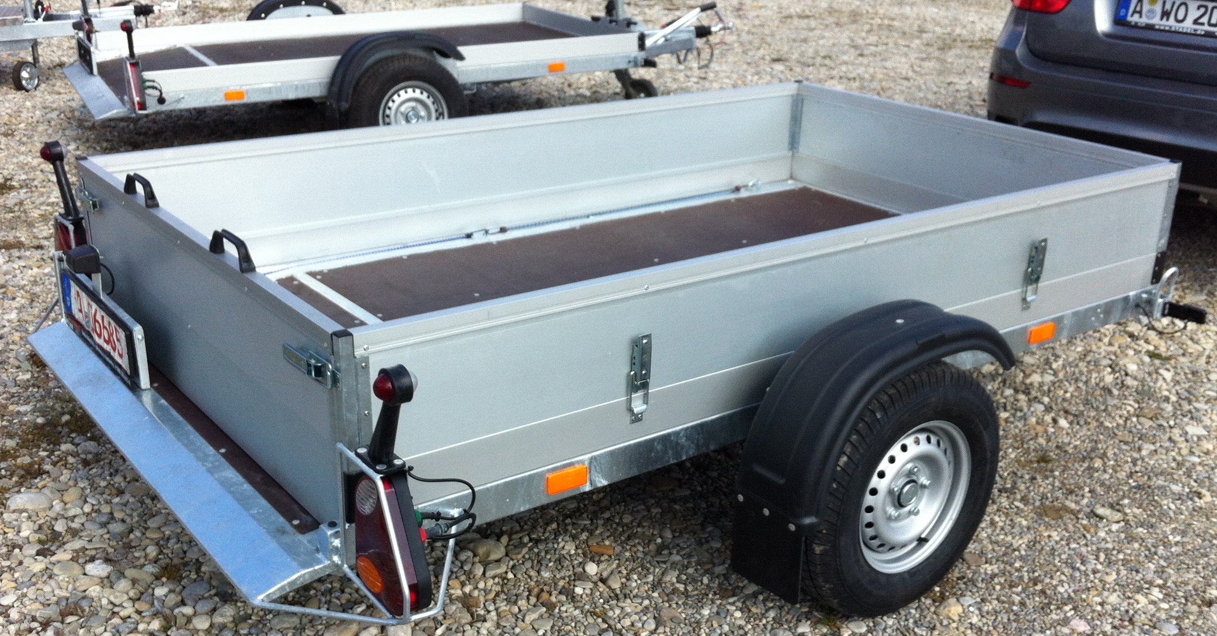 Rahmen,V-Deichsel, verschweißt, feuerverzinkt, Knott Spezial-Achse, Alu Bordwände 3-seitig , Ladefläche mechanisch gesichert und zentral entriegelbar, hydraulisch absenkbar, Boden wasserdichte Siebdruckplatte, Kotflügel, Unterlegkeil aus Kunststoff, Auffahrrampe, kompakte Beleuchtungs- einheit Jokon geschützt montiert 12 Volt, Elektrostecker 13-polig, V-Profil links und rechts mit 3 Zurrbügel versenkbar, Bereifung: 165/R13C, Farbe: silber, bronce