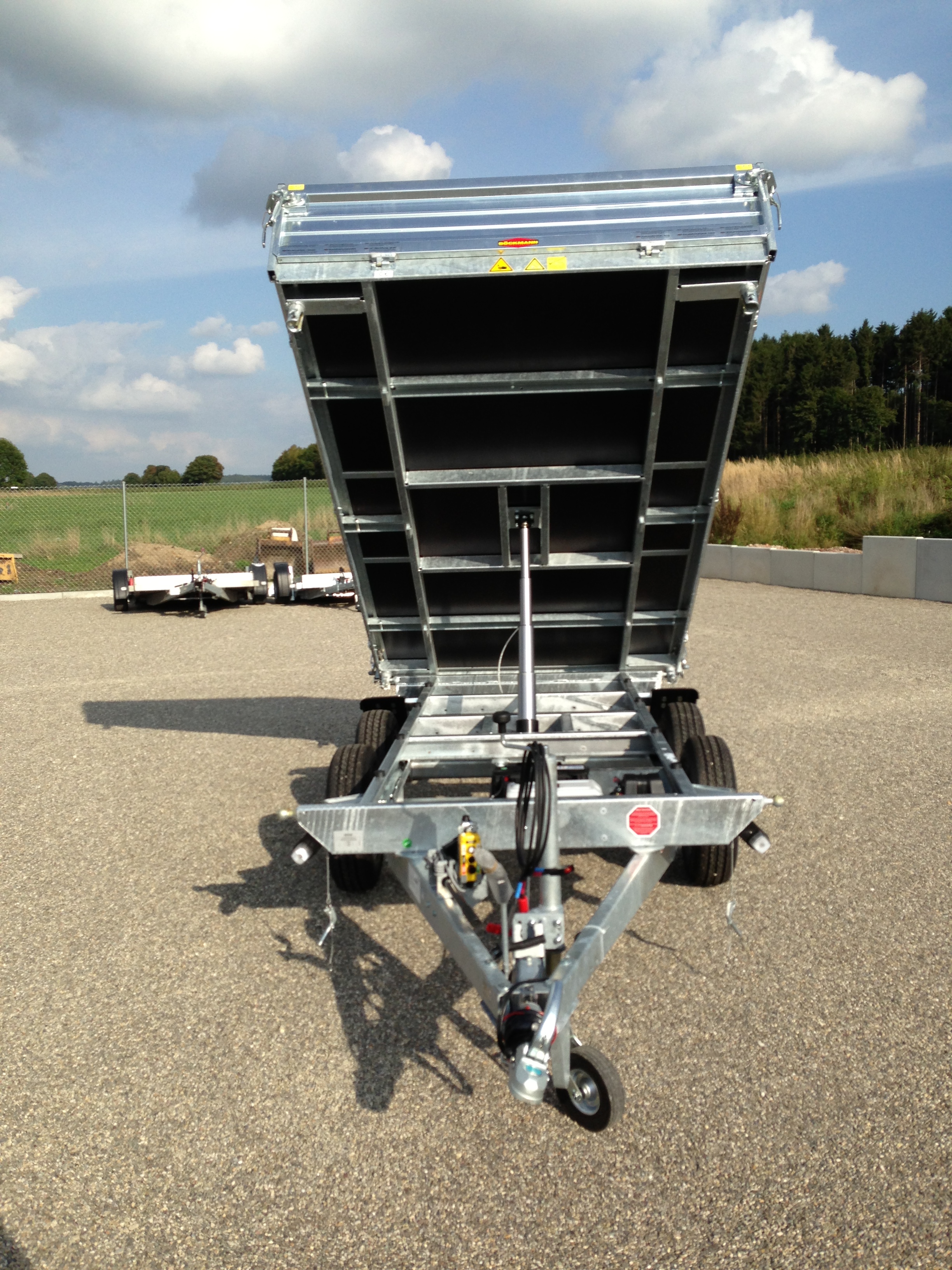 Hochlader, mechanisch hydraulisch kippbar, Bereifung 14″,Stützrad Automatik, Verwindungssteifer, feuerverzinkter Grundrahmen und Stahlprofilbrücke, wartungsfreie Gummifederachsen, 4 Zurrbügel in Seitenblende, Stahl – Bordwände 4-seitig klappbar, Pendelklappe hinten, Sicherheitsstütze, Stahlblechboden, Stahleckrungen abnehmbar, Winkelhebelverschlüsse, Lichtanlage mit Rückfahrscheinwerfer und Stecker 13-polig.7