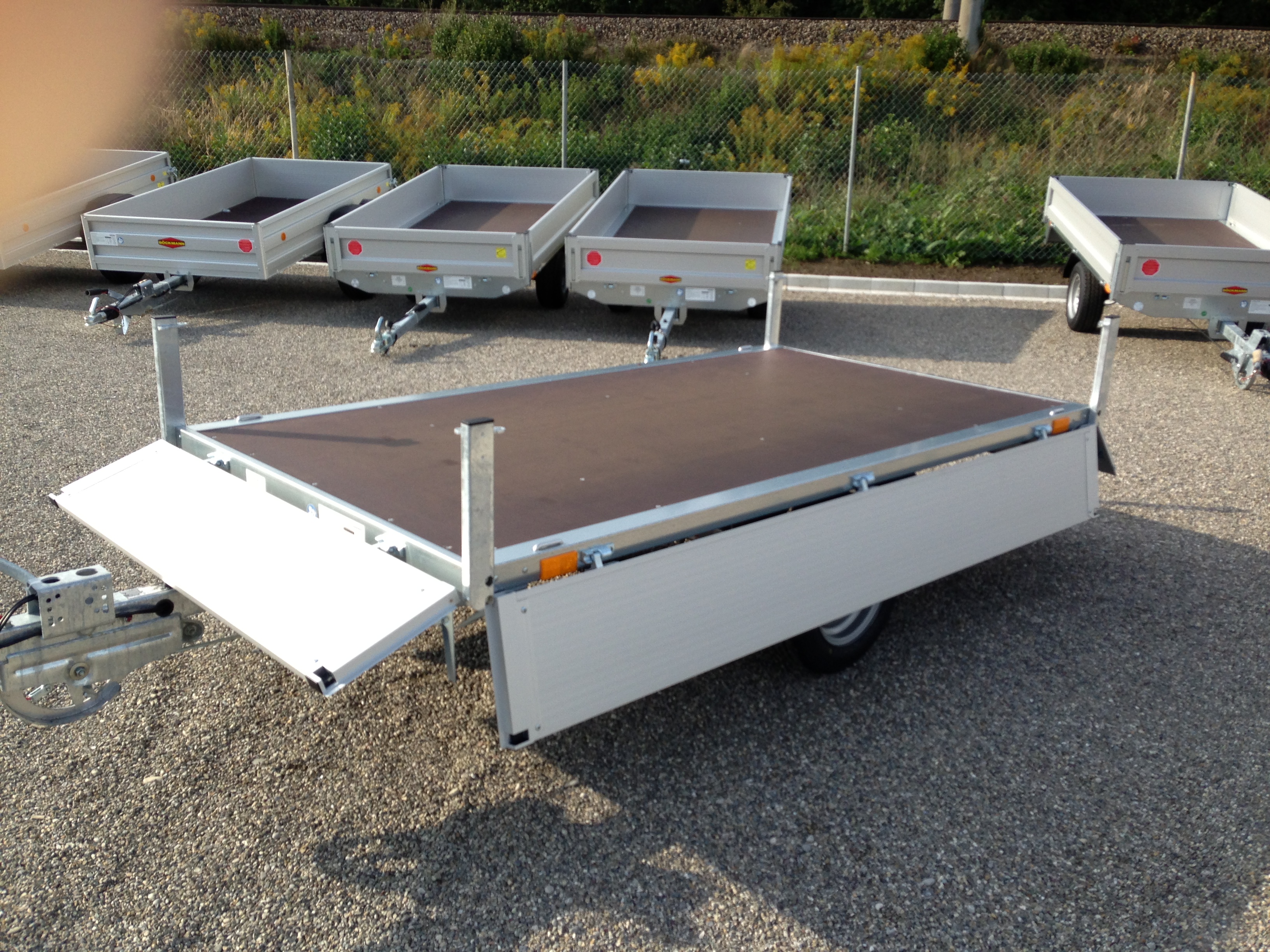 Einachsig, unbremst, Aluminium-elox. Bordwände, niedrige Ladehöhe (580 mm), Bereifung 8″,Verzinkte Stahlprofilbrücke,4 Zurrbügel in Seitenblende, Bordwand 4-seitig klappbar, Eckrungen abnehmbar, Elox. Alubordwände mit versenkten Spannverschlüssen, niedrige Ladehöhe, Sicherheitsbeleuchtung, stabiler Siebdruckboden, rutschfest, Lichtanlage mit Rückfahrscheinwerfer und Stecker 13-polig