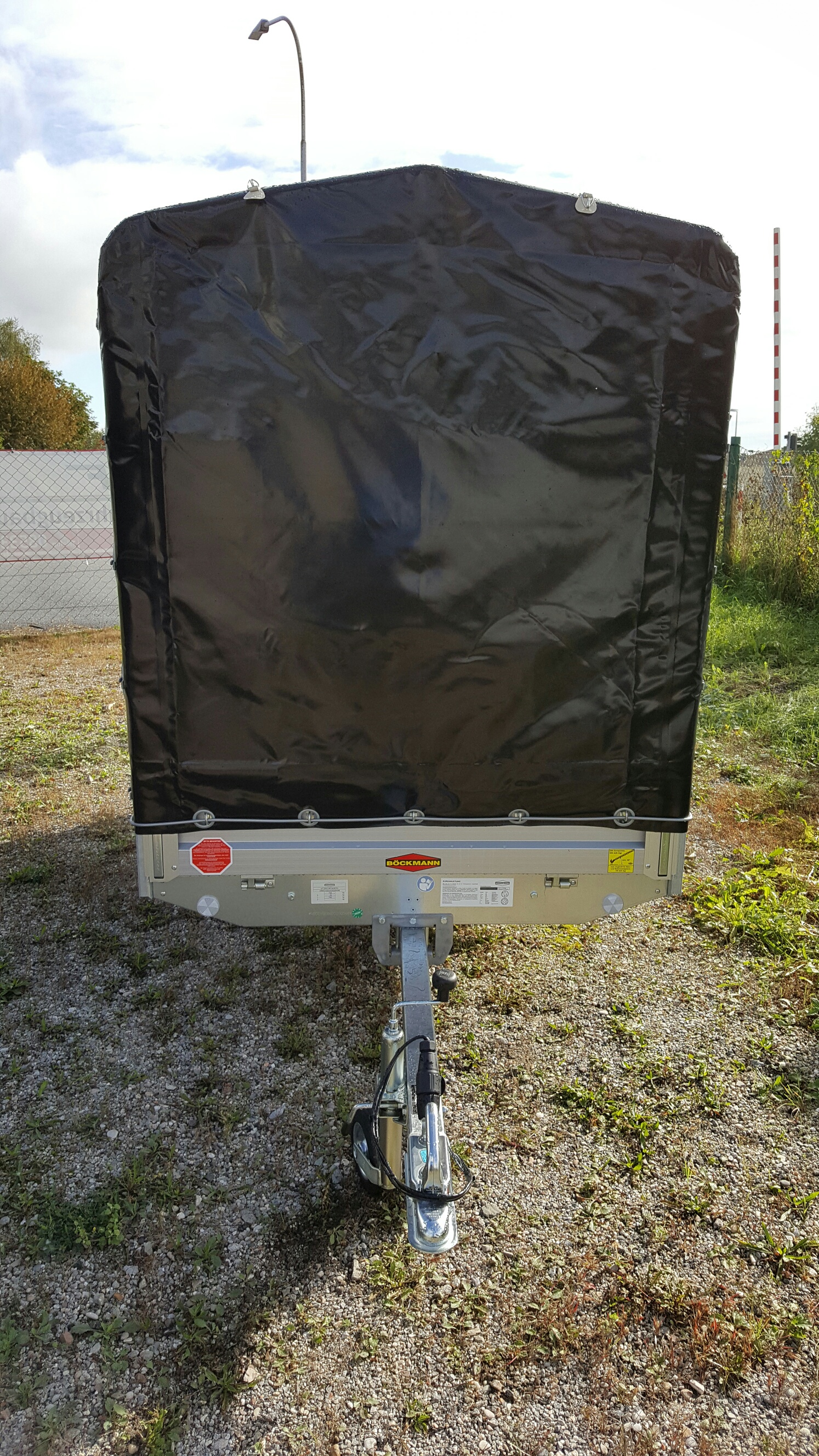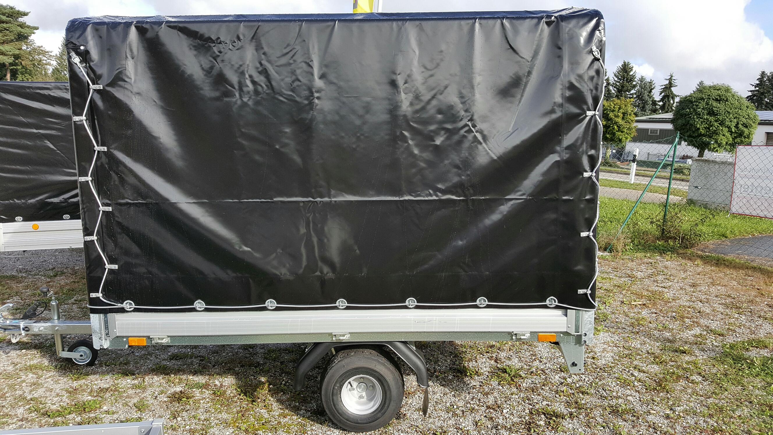Einachsig, ungebremst, Aluminium-elox. Bordwände, niedrige Ladehöhe (580 mm), Bereifung 8″, 4 Zurrbügel in Seitenblende, Bordwände in Alu, elox., Eckrungen abnehmbar, niedrige Ladehöhe, Seitenwandgalerie, Sicherheitsbeleuchtung, stabiler Siebdruckboden, rutschfest, Stirnwand klappbar, Lichtanlage mit Rückfahrscheinwerfer und Stecker 13-polig