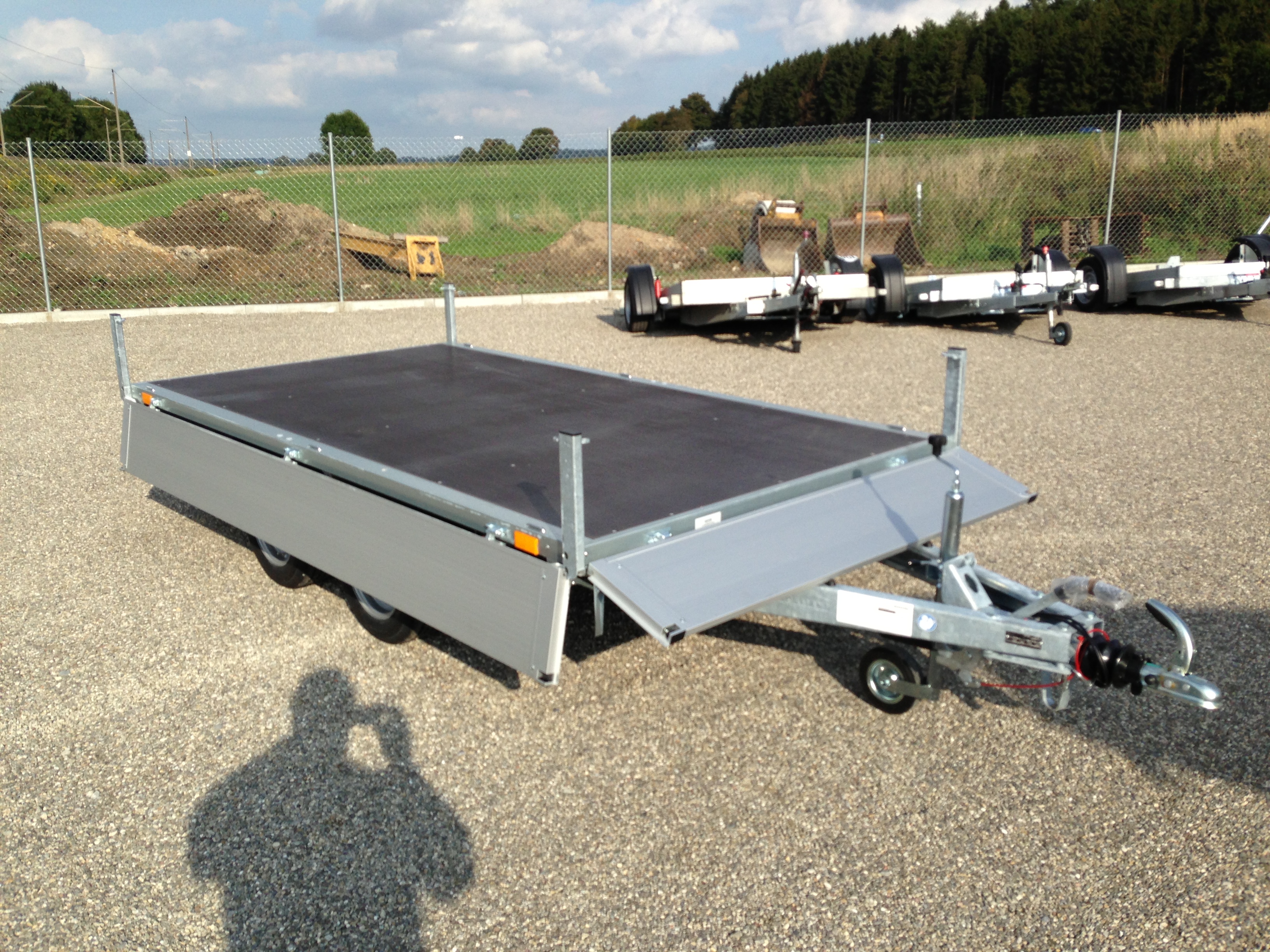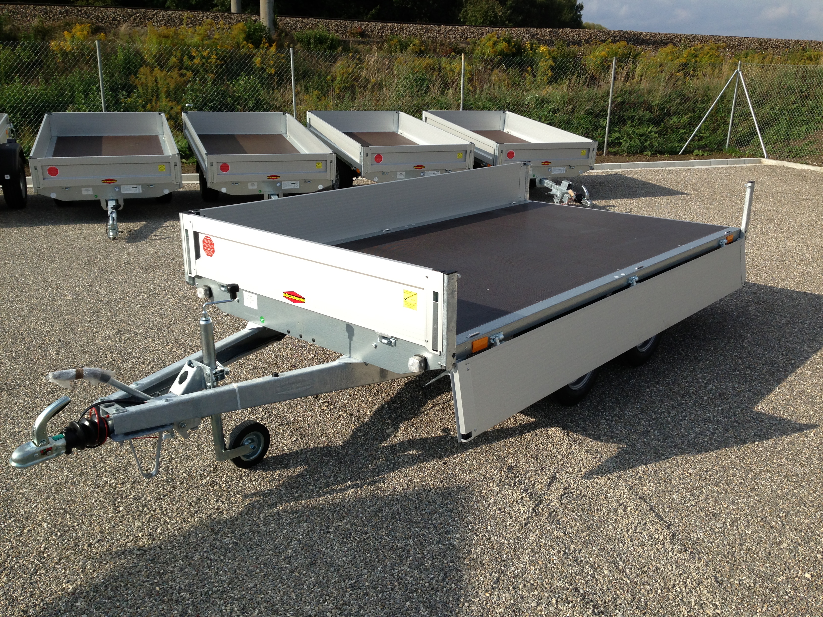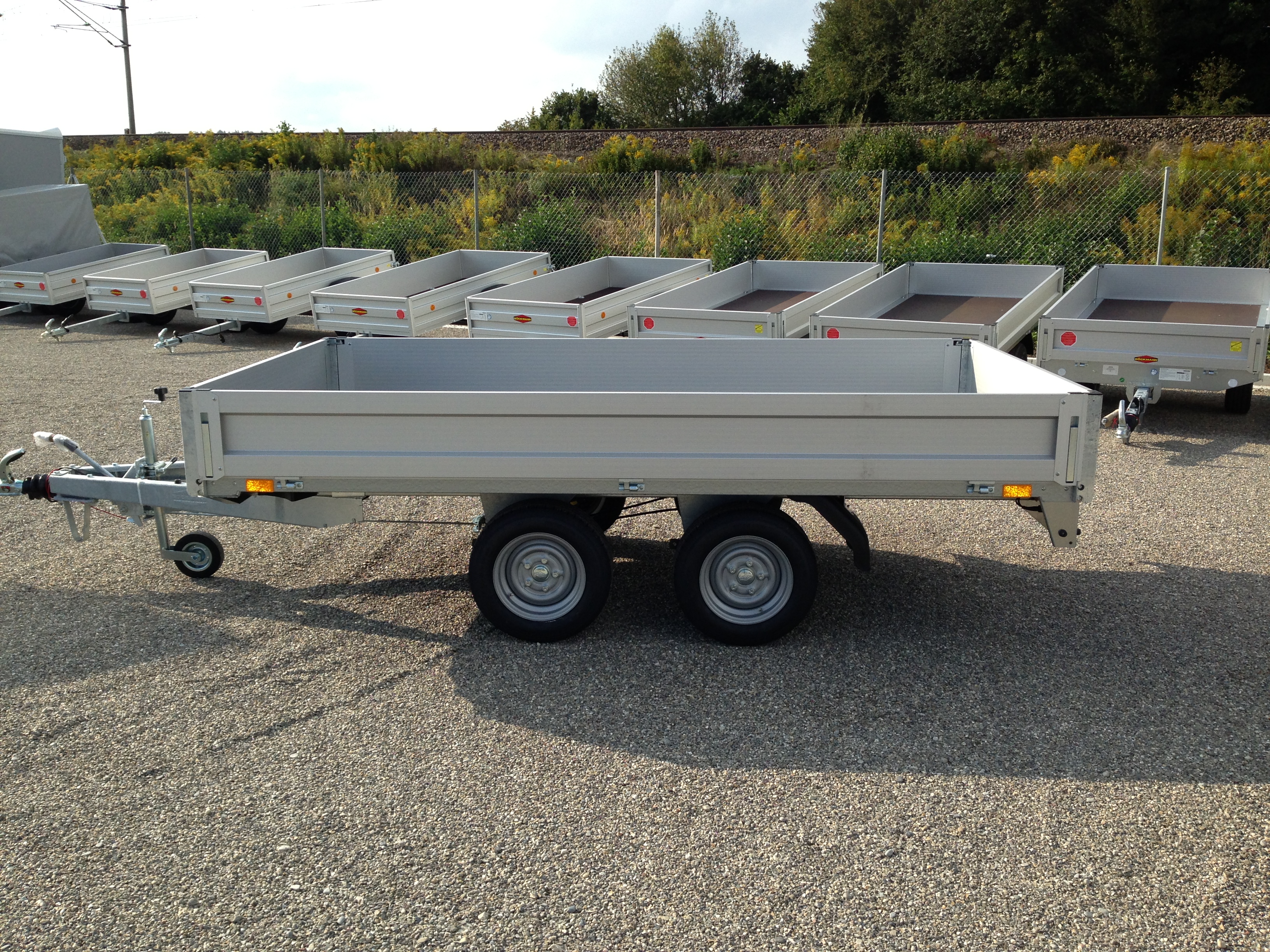 Tandem, Aluminium-elox. Bordwände, Bereifung 14″ Stützrad, verzinkte Stahlprofilbrücke, wartungs- freie Gummifederachsen mit Einzelradfederung, 6 Stück Zurrbügel in Seitenblende montiert, Bordwand 4-seitig klappbar, Eckrungen abnehmbar, Elox. Alubordwände mit versenkten Spannverschlüssen, Sicherheitsbeleuchtung, stabiler Siebdruck-boden, rutschfest, Lichtanlage mit Rückfahrschein-werfer und Stecker 13-polig