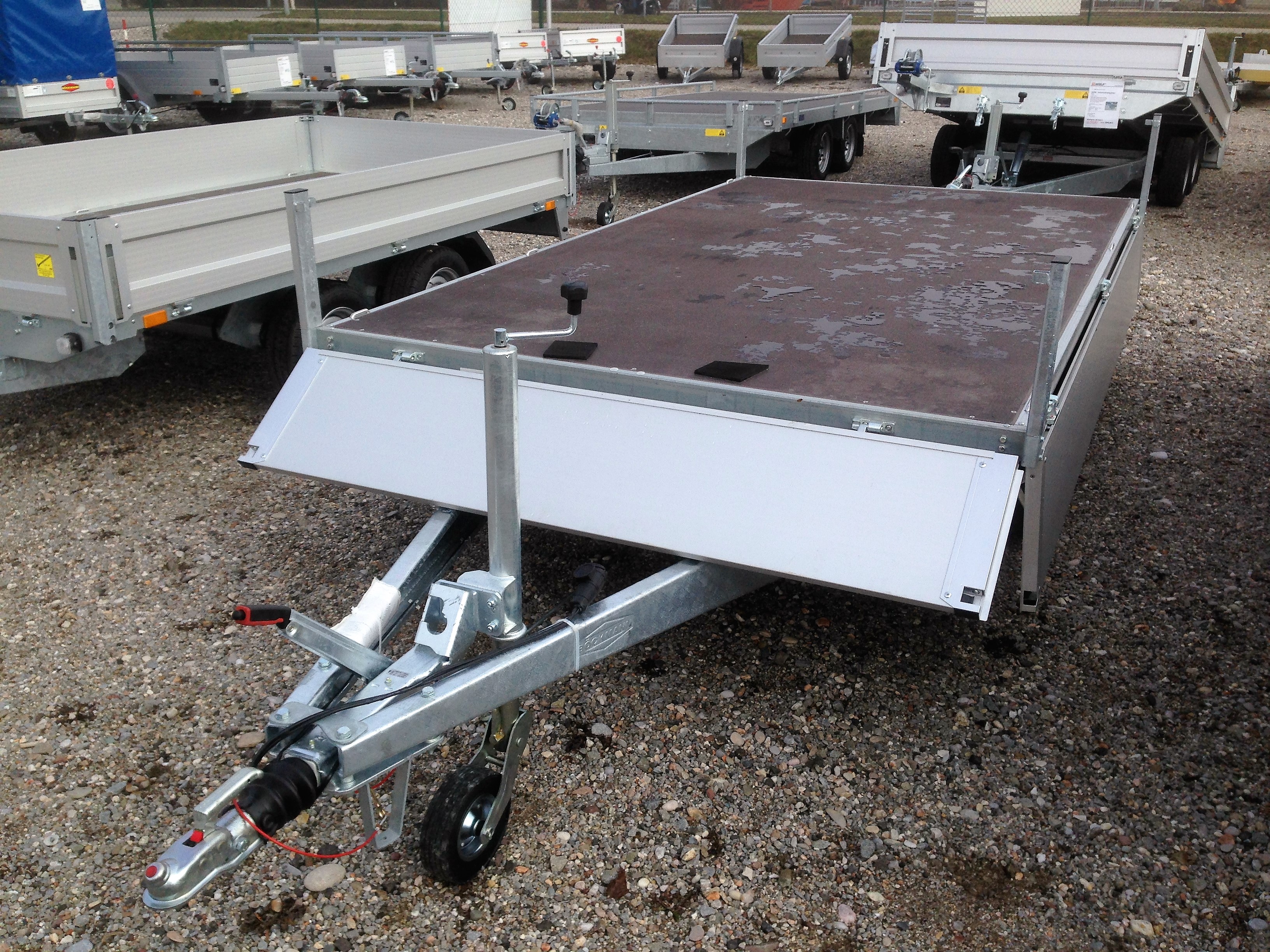 Tandem, Aluminium-elox., Bordwände, Bereifung: 14″ / Ladehöhe: 760 mm, Stützrad automatik, V – Deichsel, verzinkte Stahlprofilbrücke, wartungsfreie Gummifederachsen mit Einzelradfederung, 6 Stück Zurrbügel in Seitenblende montiert, Bordwand 4-seitig klappbar, Eckrungen abnehmbar, elox. Alubordwände mit versenkten Spann-