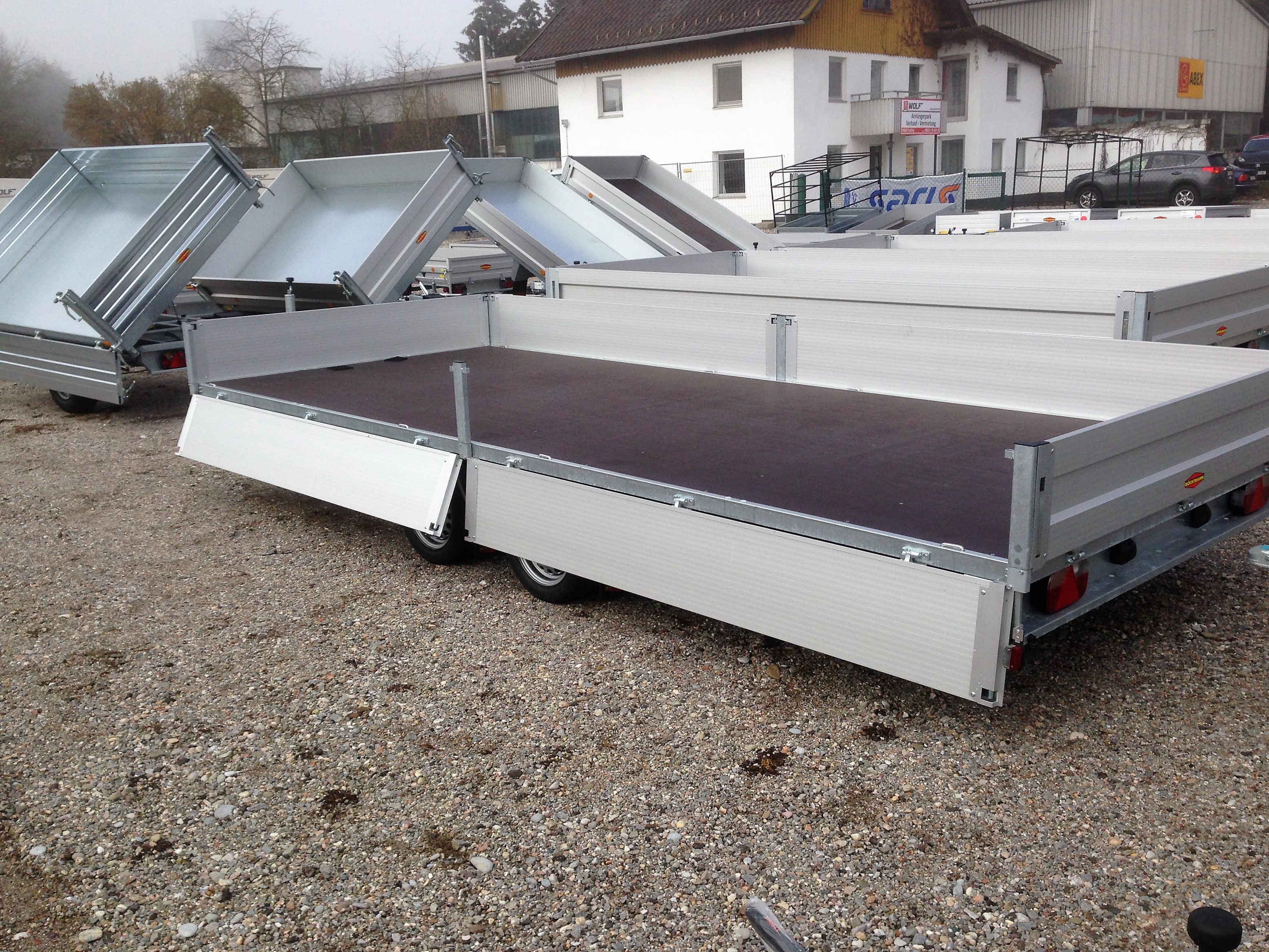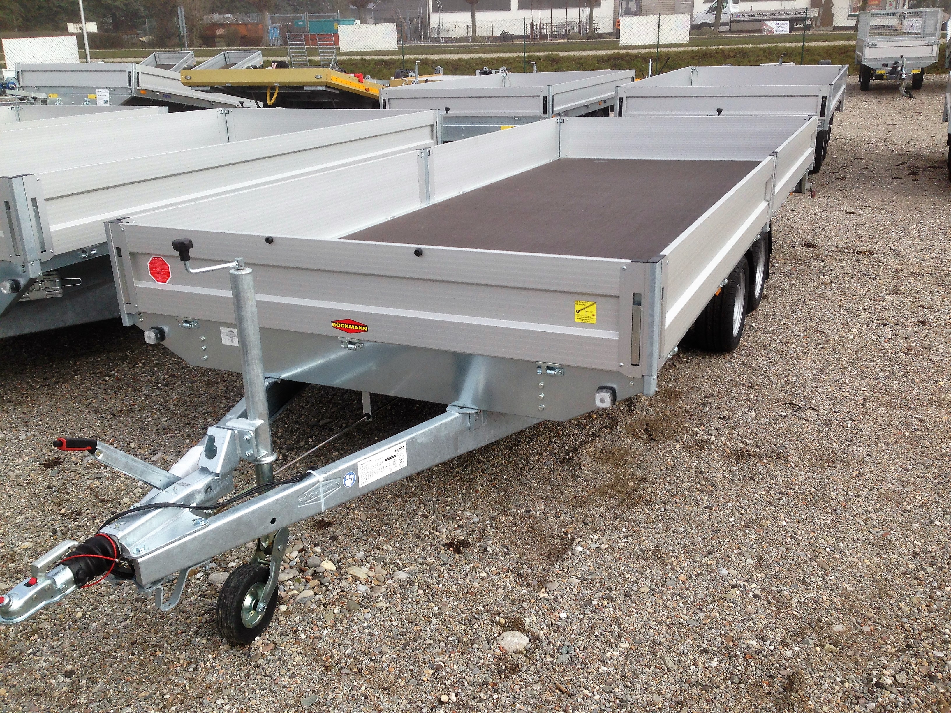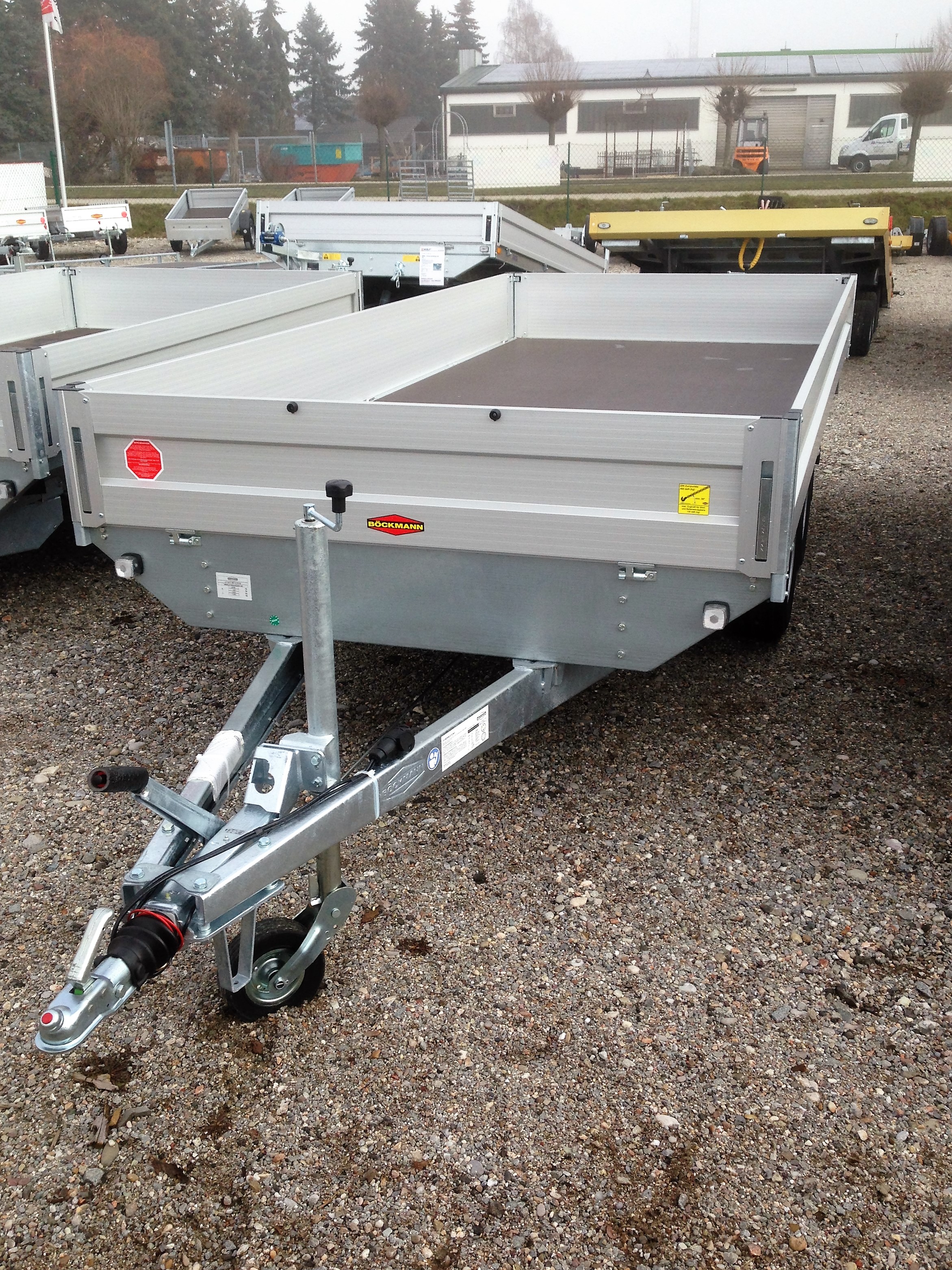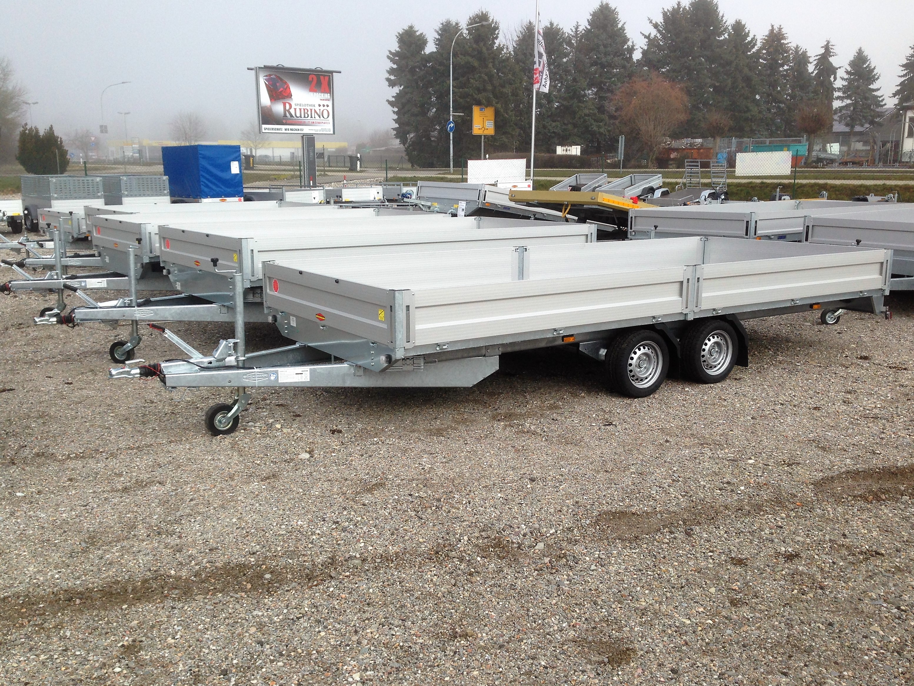 Bereifung: 13″ Ladehöhe: 640 mm Stützrad automatik, Tandem, Aluminium-elox., Bordwände ,V – Deichsel, verzinkte Stahlprofilbrücke, wartungsfreie Gummifederachsen mit Einzelradfederung, 6 Stück Zurrbügel in Seitenblende montiert, Bordwand 4-seitig klappbar, Eckrungen abnehmbar, elox. Alubordwände mit versenkten Spannverschlüssen, Seitenwandgalerie, Sicherheitsbeleuchtung, stabiler Siebdruckboden, rutschfest, Lichtanlage mit Rückfahrscheinwerfer und Stecker 13-polig