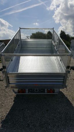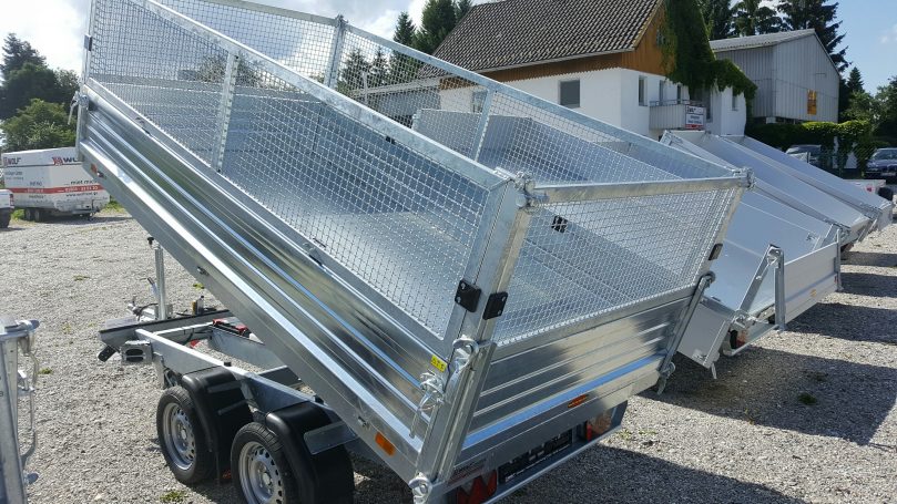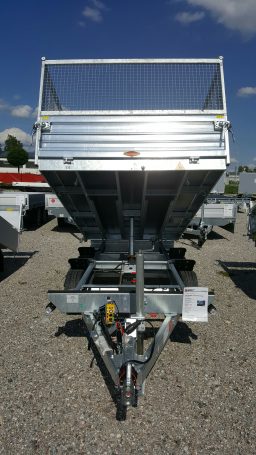 Rückwärtskipper, Hochlader, Tandem, gebremst, Aluminium-elox. Bordwände, hydraulisch kippbar, V-Deichsel, Stahlblechbodenplatte verzinkt auf Siebdruckboden, Pendelklappe hinten, Bereifung:14 “ Ladehöhe: 770 mm, Stützrad automatik, V-Deichsel, verwindungssteifer, Laubgitter, feuerverzinkter Grund-rahmen und Stahlprofilbrücke, wartungsfreie Gummi-federachsen, 4 Zurrbügel in Seitenblende, Bordwände in Alu, elox., Eckrungen herausnehmbar, Pendelklappe hinten, Stahlblechboden, Stirnwand klappbar, Lichtanlage mit Rückfahrscheinwerfer und Stecker 13-polig