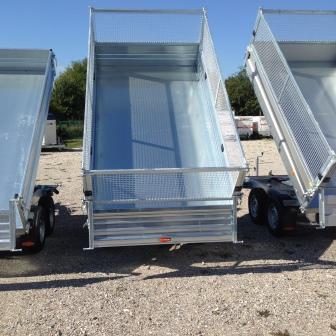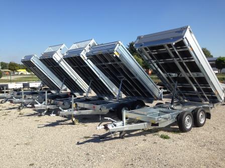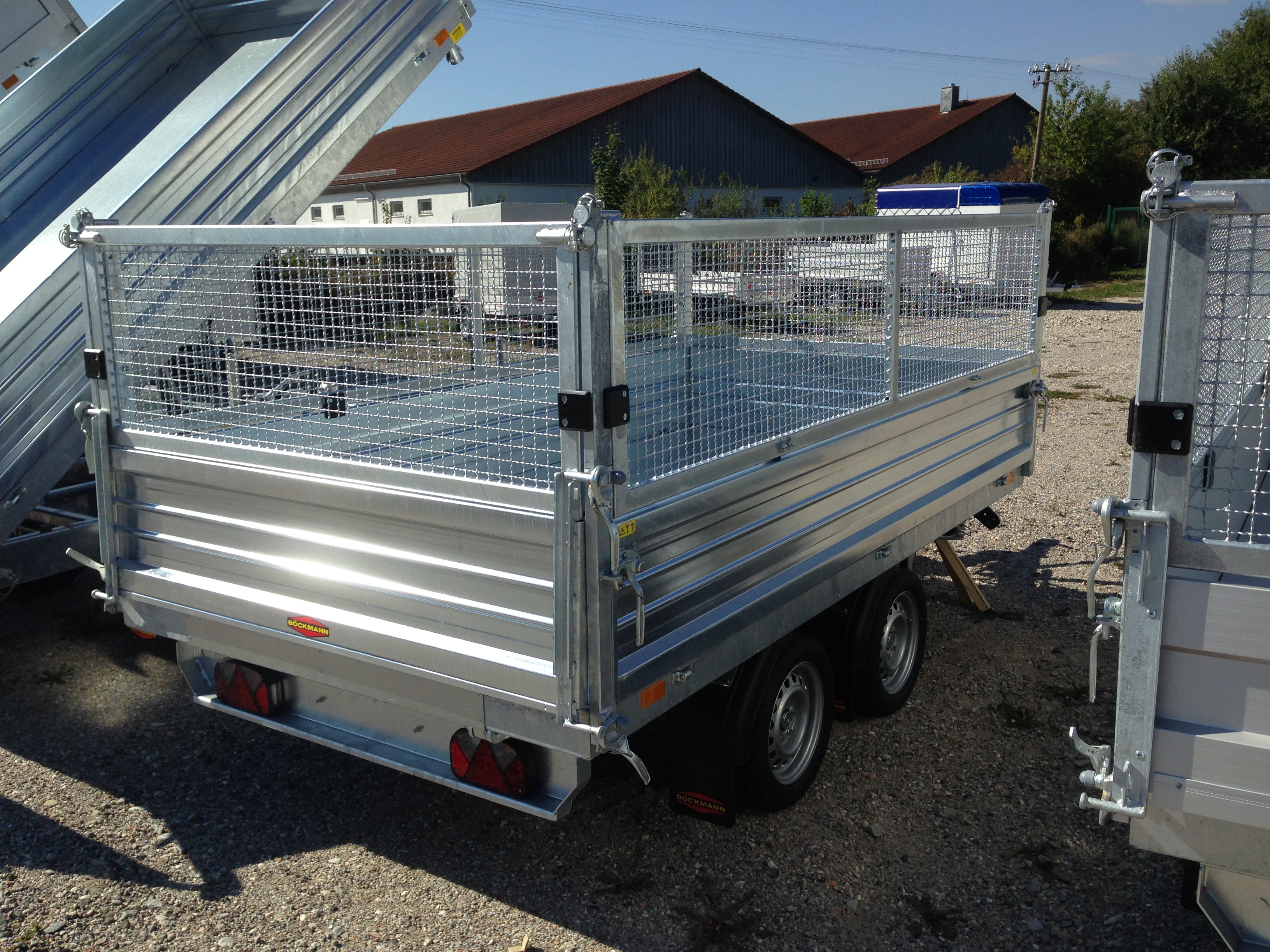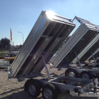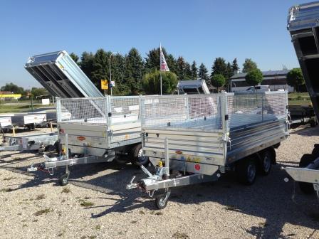 Hochlader, Tandem, gebremst, Stahl – Bordwände, hydraulisch kippbar, V-Deichsel, Stahlblechbodenplatte verzinkt auf Siebdruck- boden, Pendelklappe hinten, Bereifung: 14 “, Ladehöhe: 780 mm ,Stützrad automatik, V-Deichsel, verwindungssteifer, feuerverzinkter Grundrahmen und Stahlprofilbrücke, wartungsfreie Gummifederachsen, 4 Zurrbügel in Seitenblende, Bordwände in Alu, elox., Eckrungen herausnehmbar