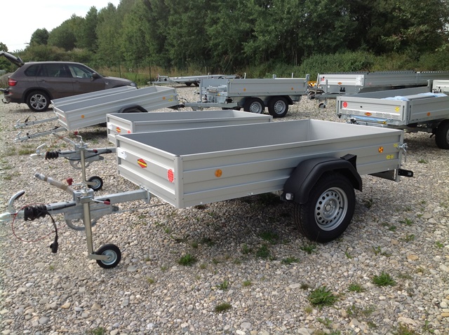 Tieflader, Einachsig, gebremst, Bordwände Alu-eloxiert, Eisenteile verzinkt, Stirnwand fest, stabiler, rutschfester Siebdruckboden, Bereifung 14″, 2 Querträger, wartungsfreie Gummifederachsen mit Einzelradfederung, große Sicherheitsbeleuchtung mit integrierter Nebelschluß- leuchte, Lichtanlage mit Rückfahrscheinwerfer und Stecker 13-polig